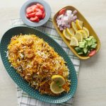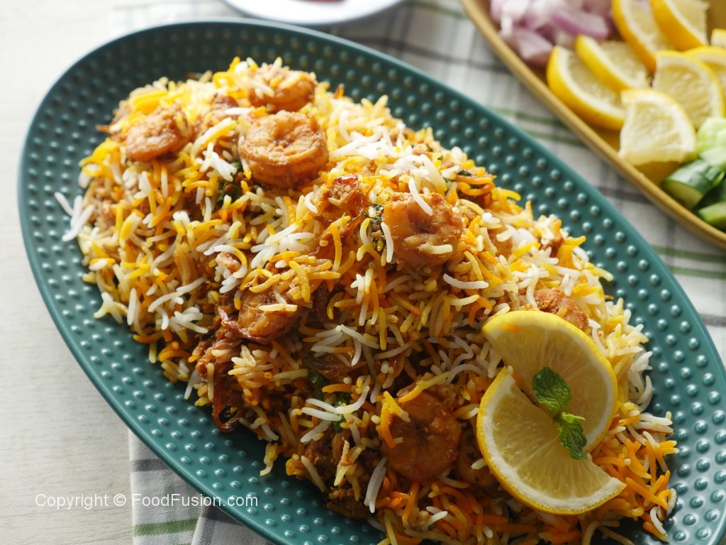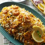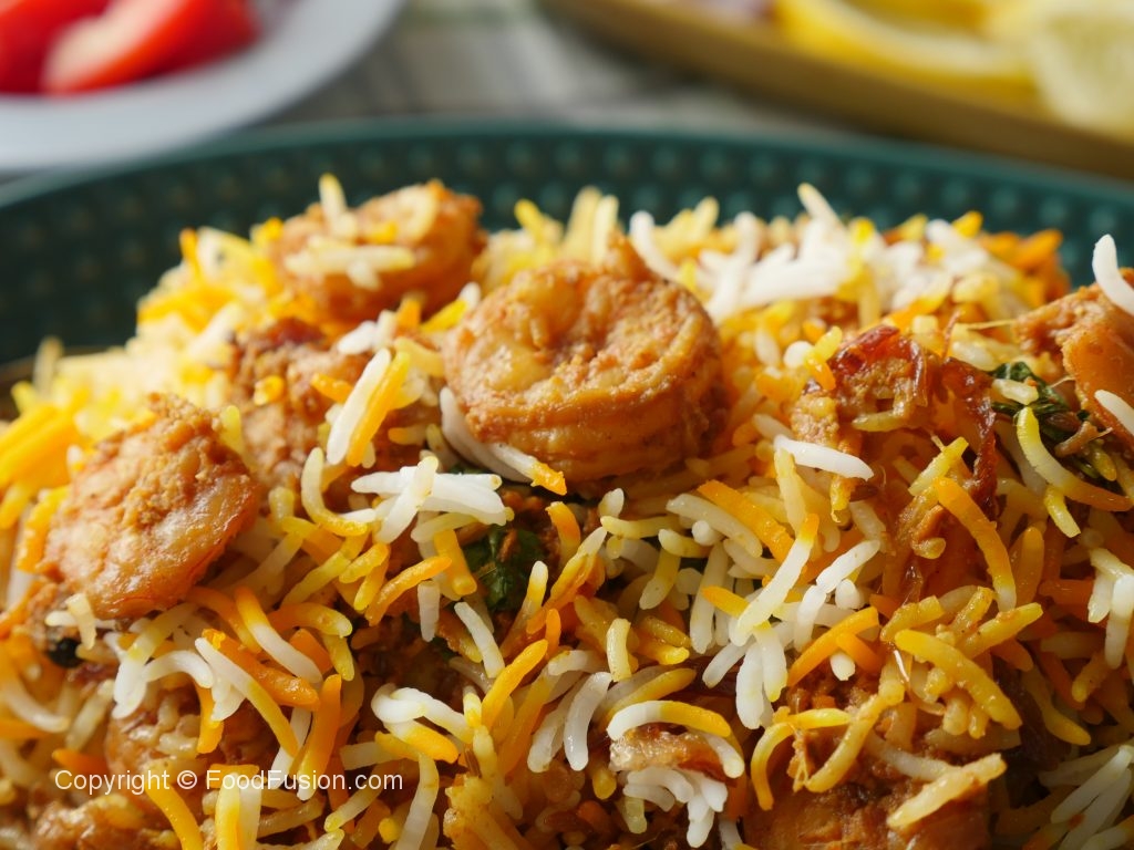 Pot mein boiled chawal ki half quantity,fried pyaz,prawn gravy masala,hara dhania,baqi bachay hoye chawal,dissolve zarda ka rang aur fried pyaz dal dein.