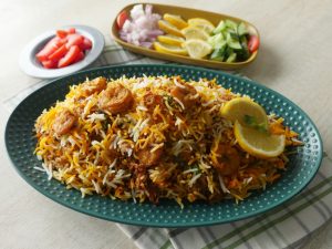 In pot,add half quantity of boiled rice,fried onion,prawn gravy masala,fresh coriander,remaining boiled rice,dissolve yellow food color and fried onion.