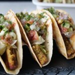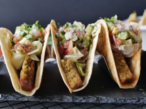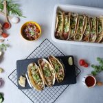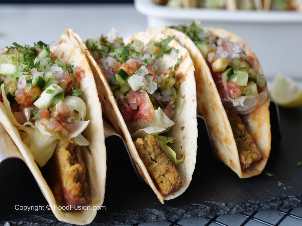 -In tortillas,add iceberg,prepared roasted tomato salsa,cucumbers,onion,fresh coriander & drizzle tabasco sauce & serve (makes 8).