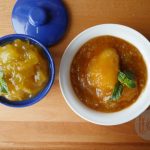 In frying pan,add raw mangoes,cover and dry roast on medium heat until pulp is soft,turn sides occasionally,peel off skin and take out the raw mango pulp.
