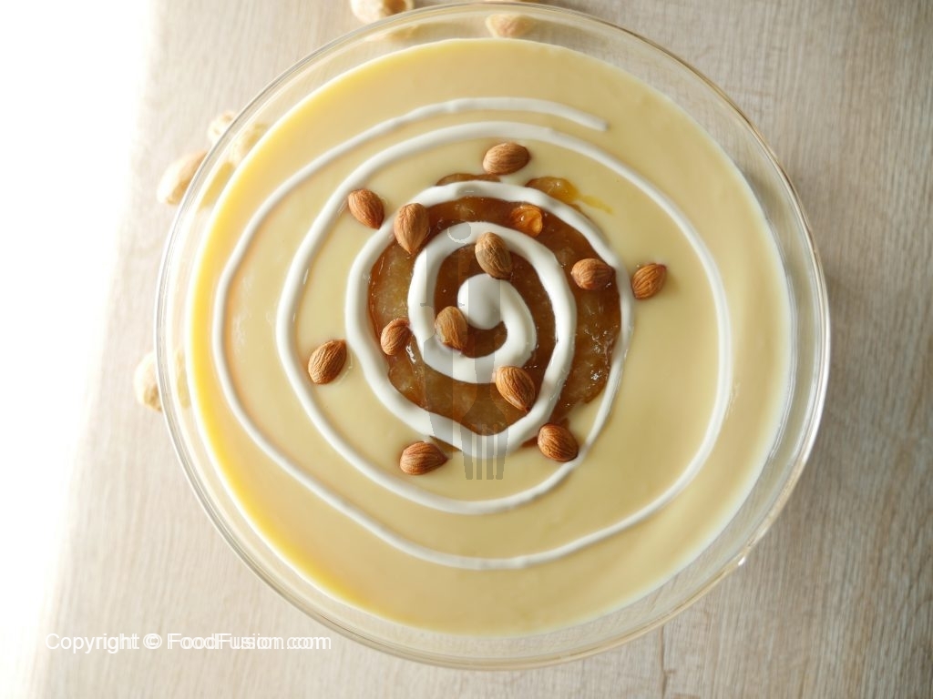 Serving bowl cooked khubani mixture aur tayyar custard dal dein aur cooked khubani mixture,cream aur khubani ka badam sa garnish ker ka serve karein.