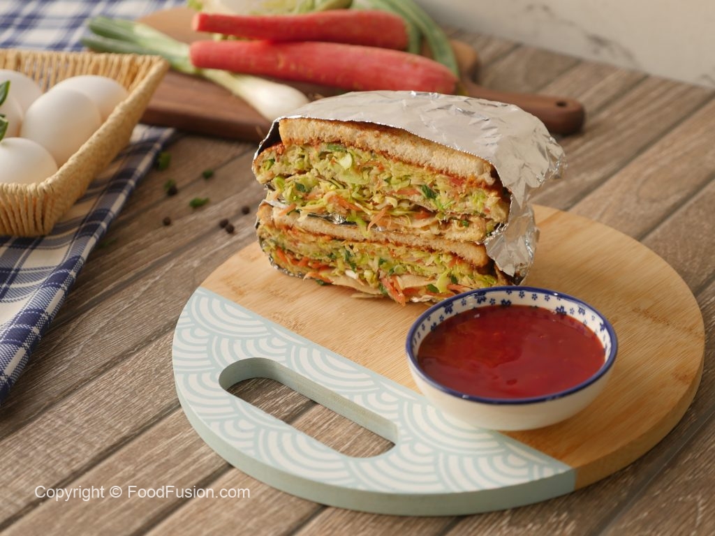Vegetable & egg omelet per reserved vegetables,chicken salami dal ker toasted bread slice rakh dein phir flip ker ka bareek cheeni aur tomato ketchup dal dein aur top per remaining bread slice rakh dein.