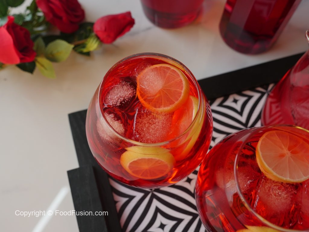 In serving glass,add ice cubes,lemon slices and prepared laal sharbart & serve!