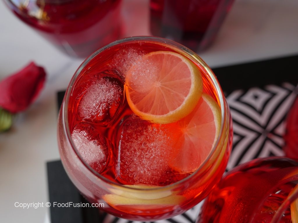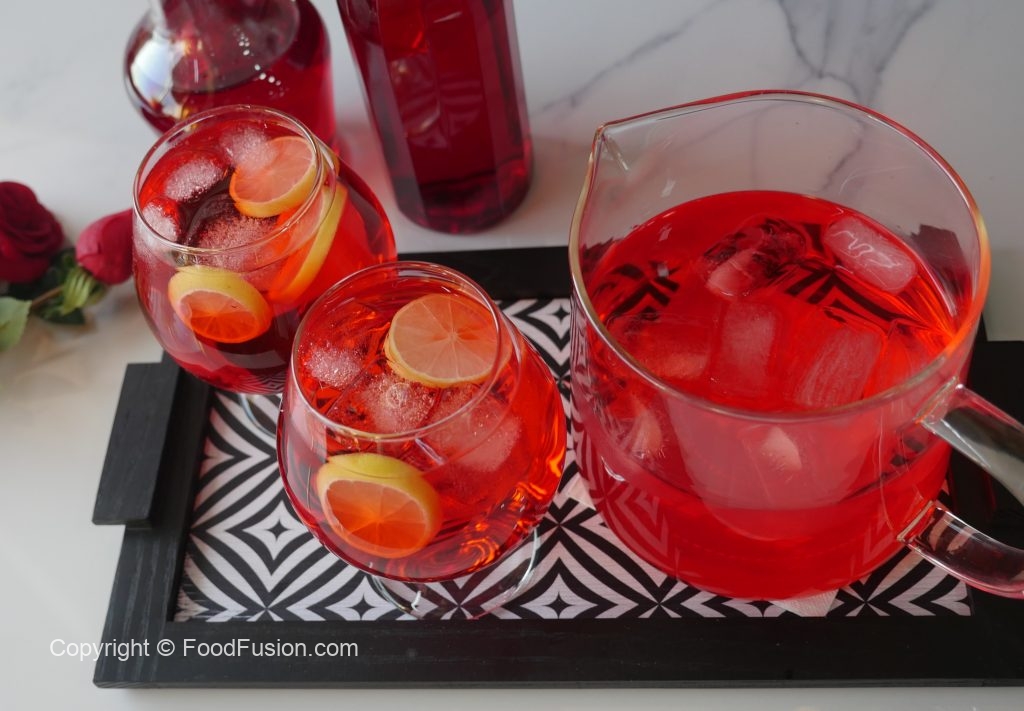 Serving glass mein ice cubes,lemon slices aur tayyar laal sharbat sharbat dal ker serve karein.