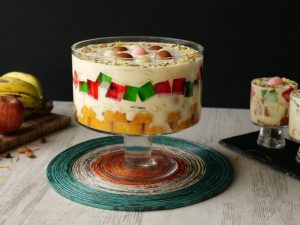 Trifle bowl mein plain cake ki two layers laga lein aur reserved cocktail syrup dal dein.
