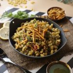In a bowl,add macaroni,chickpeas,potatoes,onion,tomato,green chilli,cumin seeds,red chilli crushed, chaat masala,prepared green chutney (2 tbs),prepared meethi chutney (2 tbs) & mix well.