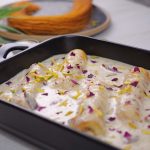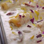 -In a serving dish, add prepared malai rolls, prepared sheer khurma, garnish with pistachios & dried rose petals!