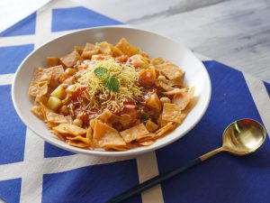 On serving plate,add boiled chickpeas,potato,green chili,prepared manchurian sauce,red chili crushed, chaat masala,papri and sev nimco.