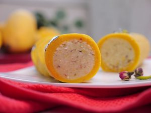 -Cut into thick slices,garnish with edible silver leaf,pistachios & serve!
