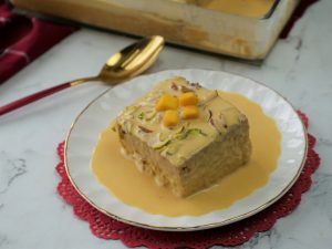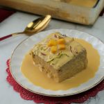 -Slowly pour prepared mango malai milk (reserve 1 cup for later use) over the top of the cake, filling holes,cover with cling film & refrigerate until chilled.