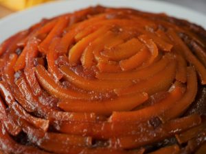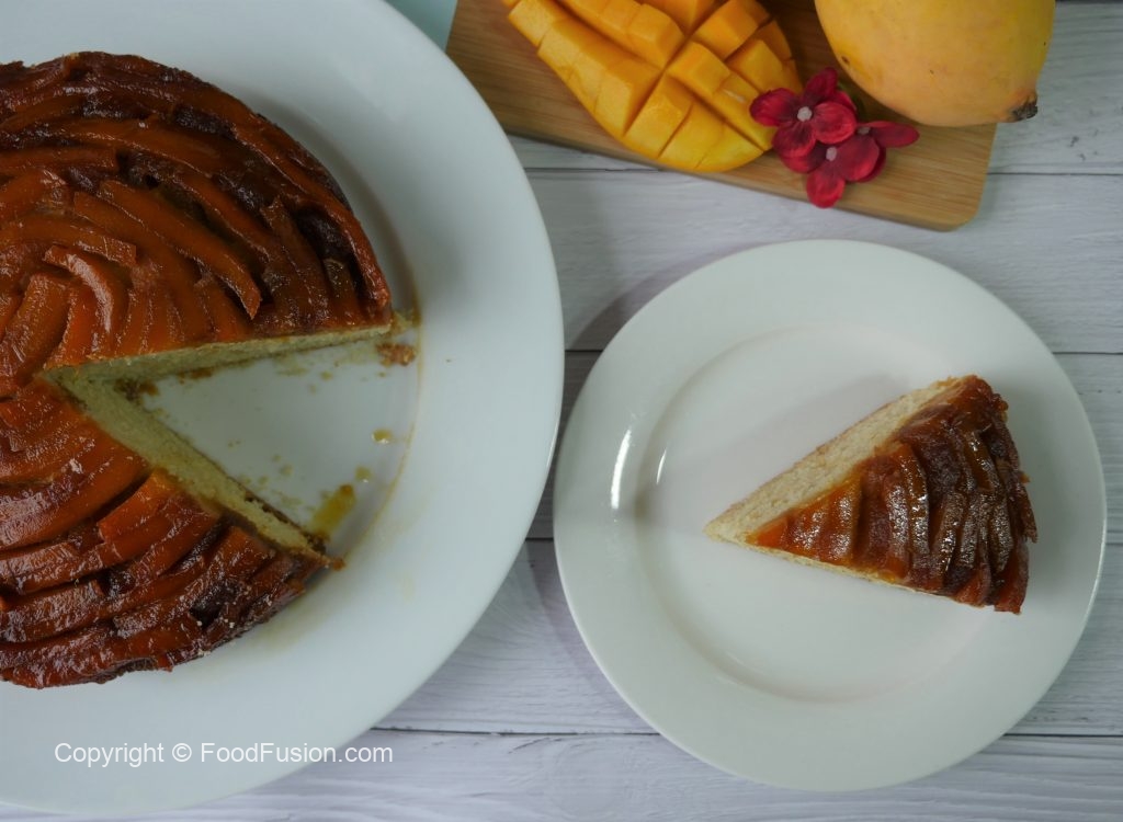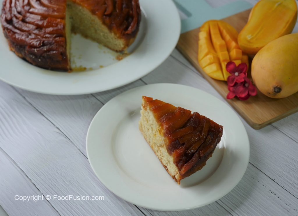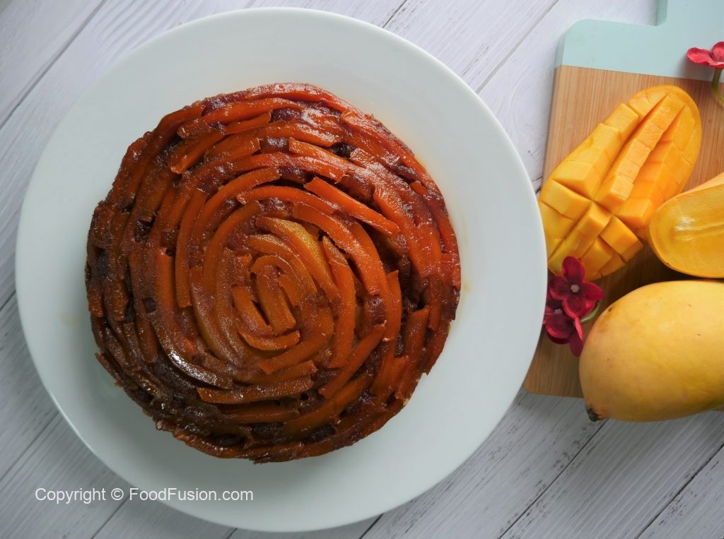 8 x 8 inch baking pan mein caramelized cheeni dal ker mango slices laga lein & side per rakh dein.