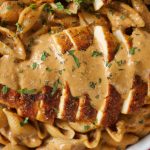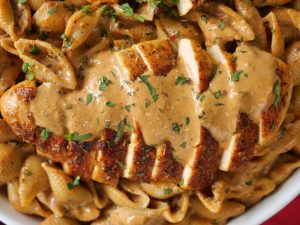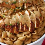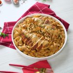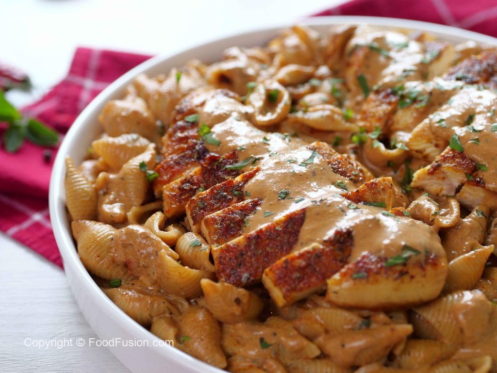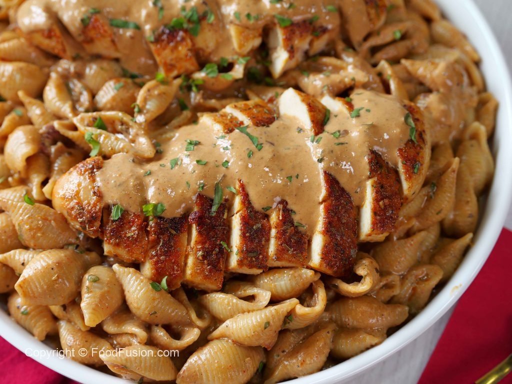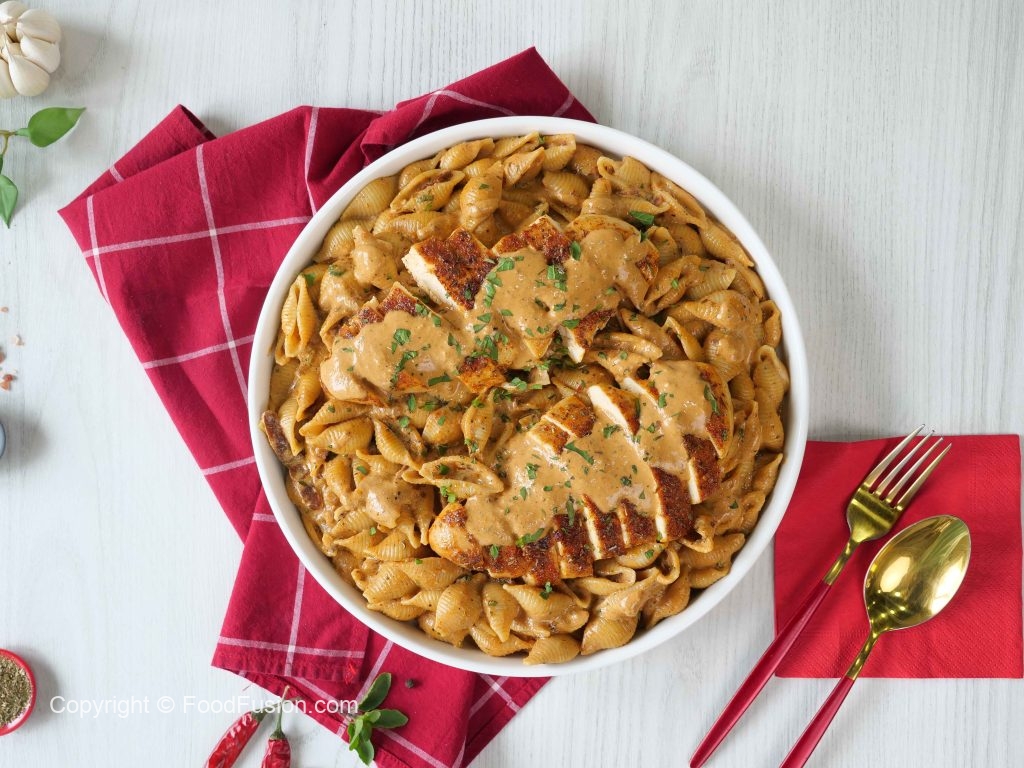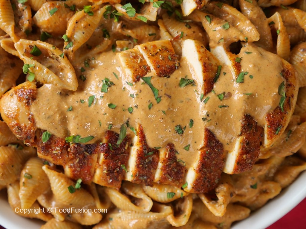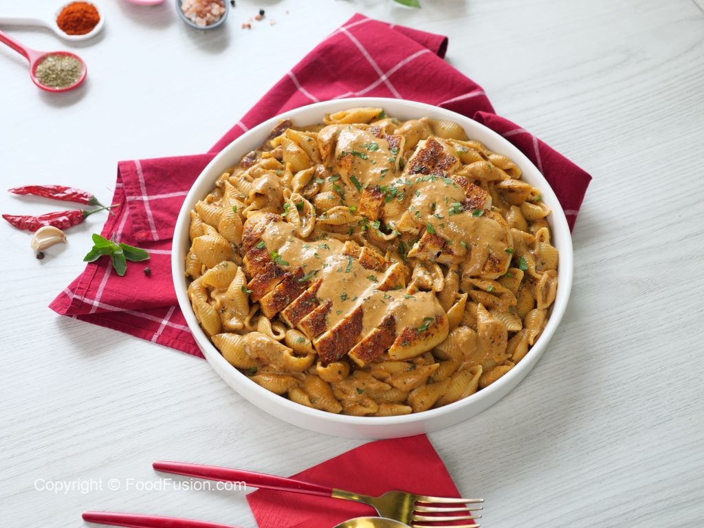 -Serving dish mein cooked pasta,spicy chicken fillet,pasta sauce aur fresh basil leaves dal kar serve karein!