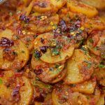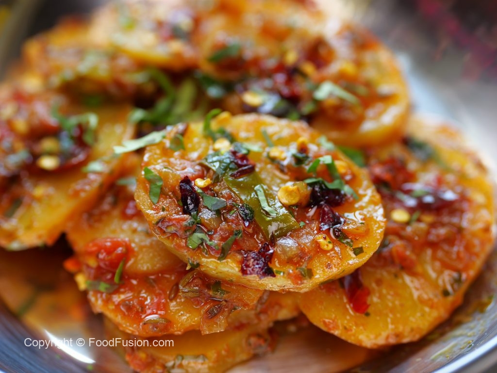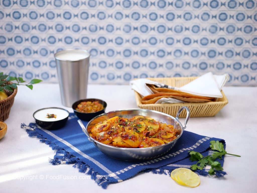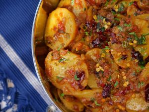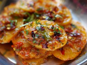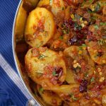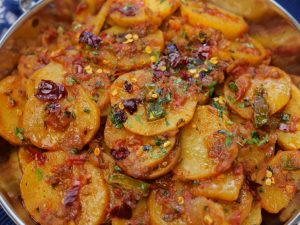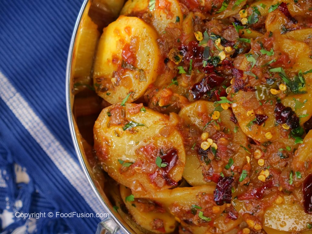 -In a serving plate add aloo katli. Garnish with fresh coriander, reserved curry leaves & red chillies.