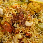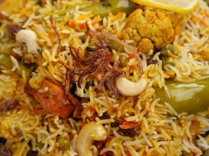 -Add fresh coriander,mint leaves,cardamom powder,fried raisins & cashew nuts,reserved fried onion, kewra essence,green chillies,orange food color,desi ghee,cover with kitchen towel and lid & steam cook on low flame for 12-15 minutes.