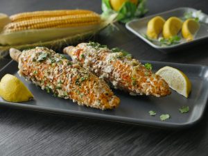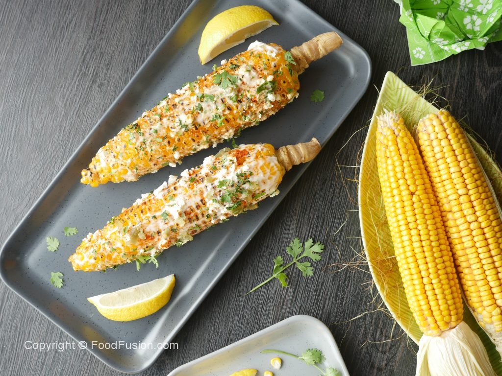 Brush corn with mayonnaise+ cream,spinkle feta cheese,red chili powder,paprika powder,jalapenos, fresh coriander and squeeze lemon juice.