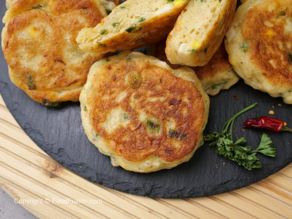 -In a frying pan,heat cooking oil,pipe out prepared mixture & flatten with the help of greased spoon & fry pancakes from both sides on low flame until golden brown.