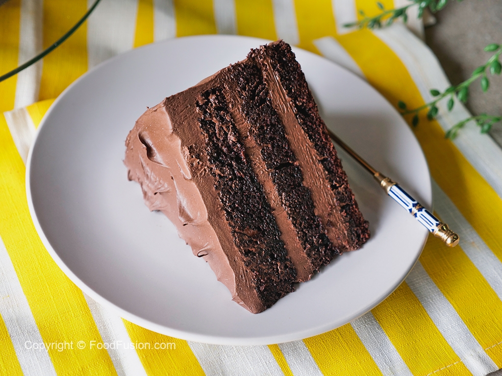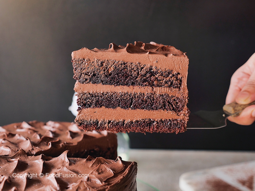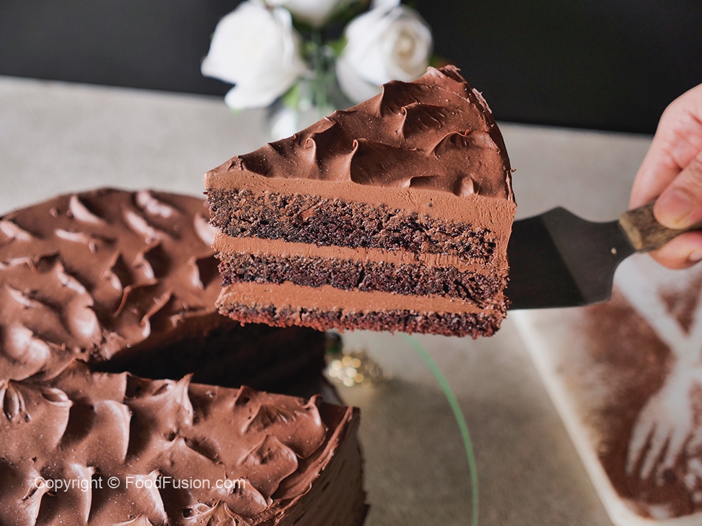 Ab tayyar chocolate frosting dal ker pheela lein aur same yehe process cake ki third layer ka saath karein aur frosting laga ker cake ki sides ko cover ker lein.
