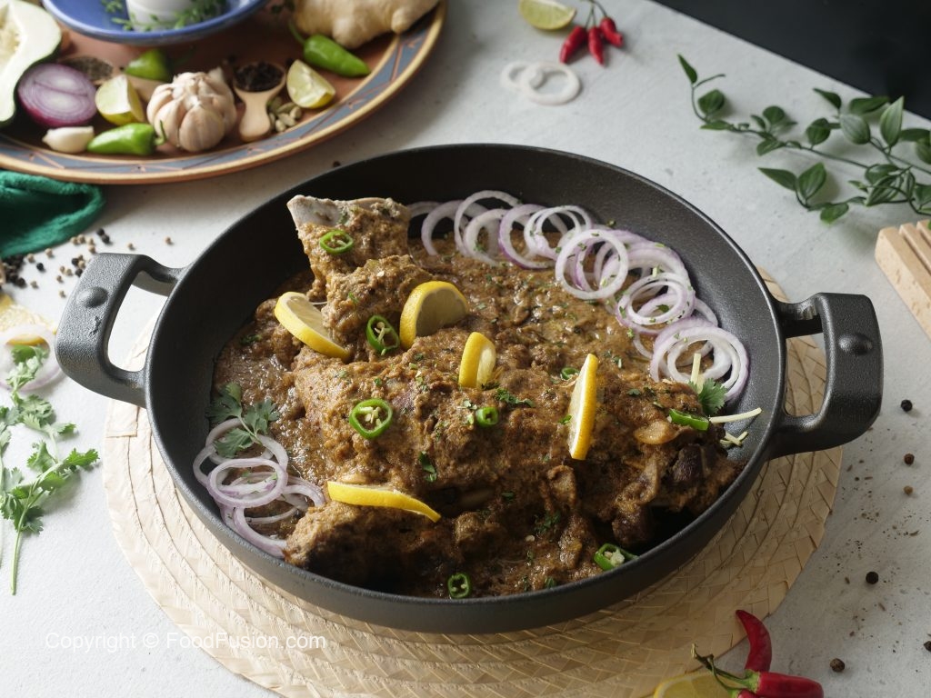 Fried mutton leg/dasti dal ker upper sa gravy dal dein aur dhak ker halki ancch per gul janay tak paka lein (1 & ½ hour) & bech bech mein rotate & flip ker lein.