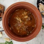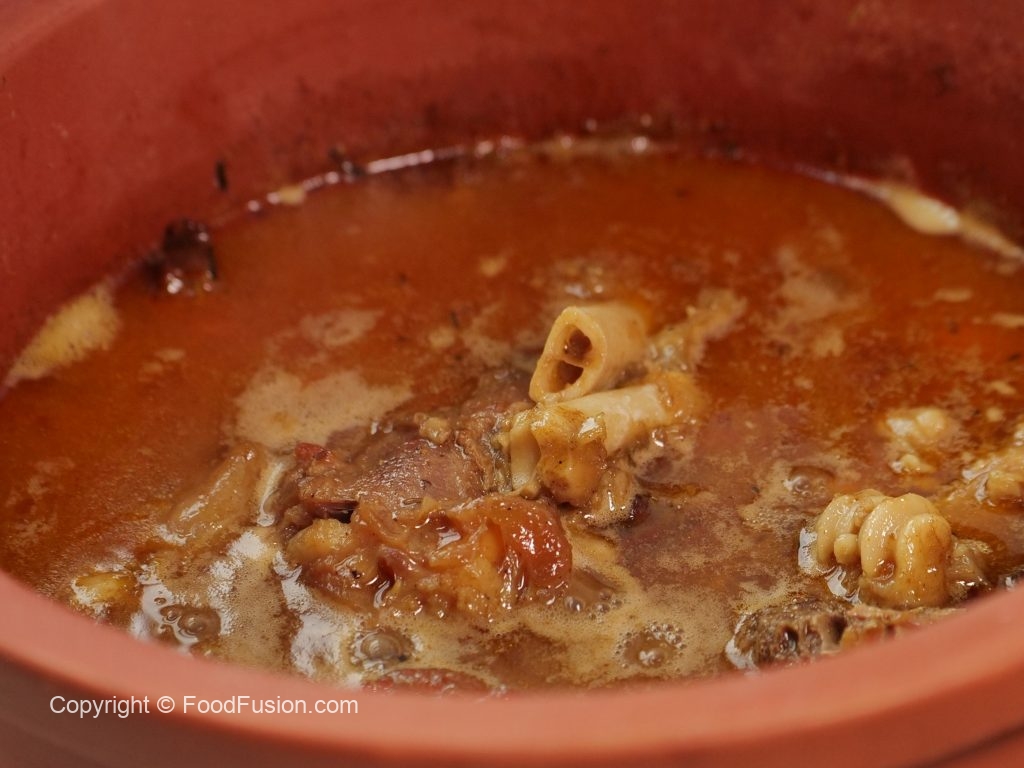 In mutton trotters,add salt,black cardamom,cloves,black peppercorns,cinnamon sticks,bay leaf,ginger garlic paste,hot water and mix well,bring it to boil,cover and cook on low flame until tender (2-3 hours) 3 cups of water should be left.