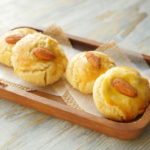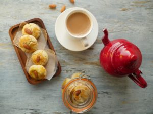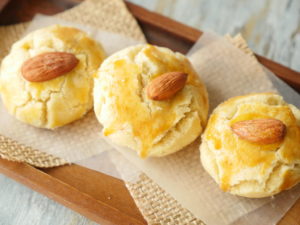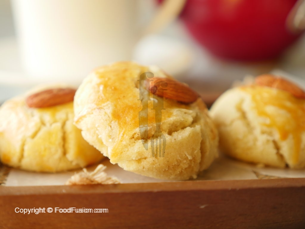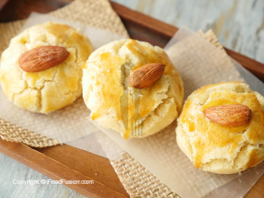On baking plate/tray,place butter paper and nan khatai balls,egg yolk wash and place roasted almond on top.