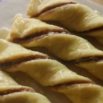 On baking tray lined with butter paper,place nutella strips and holding it at one end,carefully twist it several times until it forms a spiral and let it rest for 20 minutes.