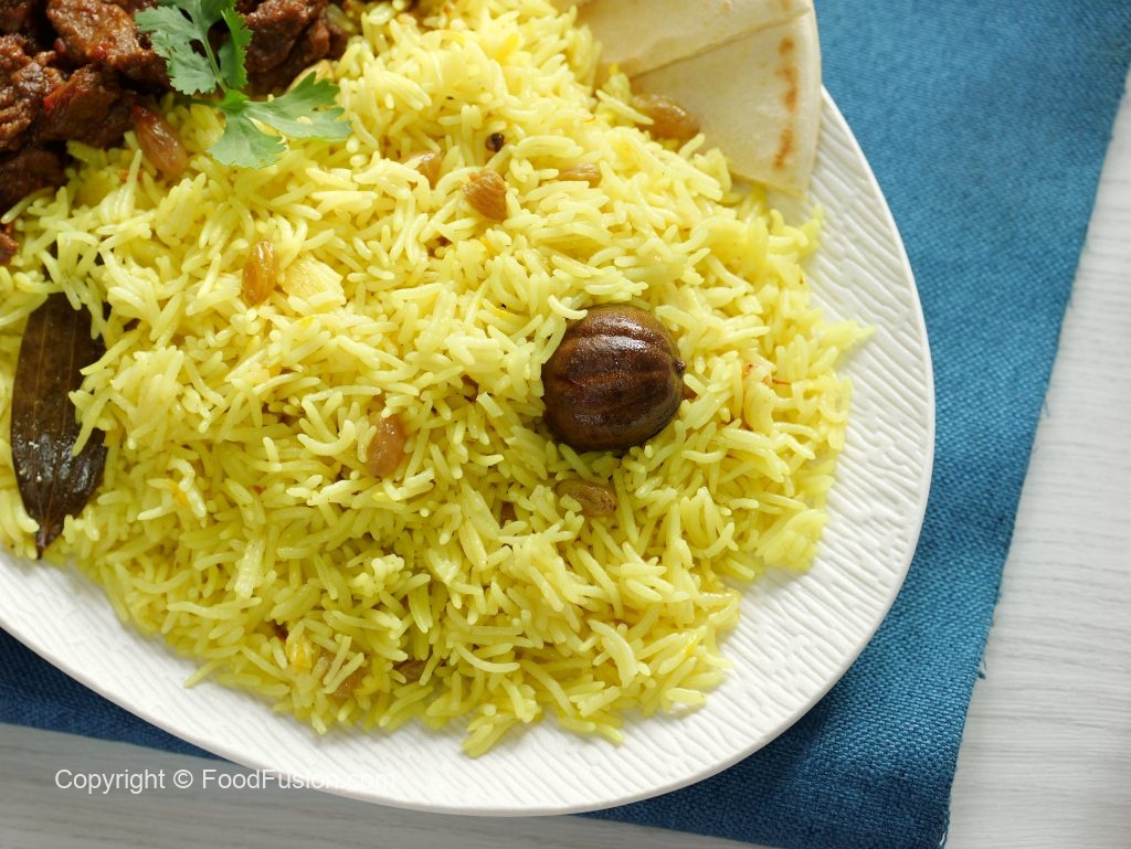 -Add rice,raisins,cinnamon sticks,dried lemon,saffron strands,cloves,green cardamoms,black peppercorns,bay leaves,turmeric powder,pink salt & mix well on medium flame for 2-3 minutes.