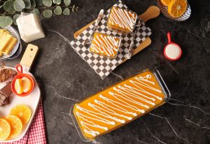 Cake rusks ko orange juice may achi tarah dubo kar assembling dish may set karen aur upper sa orange juice dal dein phir 1 ghanta k liye refrigerate karden.