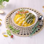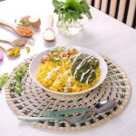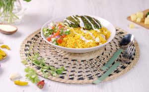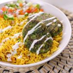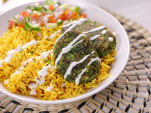 -Serve masala rice with palak cheese kabab,salad & yogurt raita.