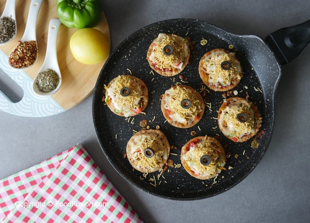 Papri per pizza sauce dal ker pheela lein,cooked chicken,shimla mirch,pyaz,tamatar,cheddar cheese, mozzarella cheese,lal mirch crushed aur dried oregano dal ker dahk dein aur halki ancch per cheese melt hunay tak paka lein (2-3 minutes).