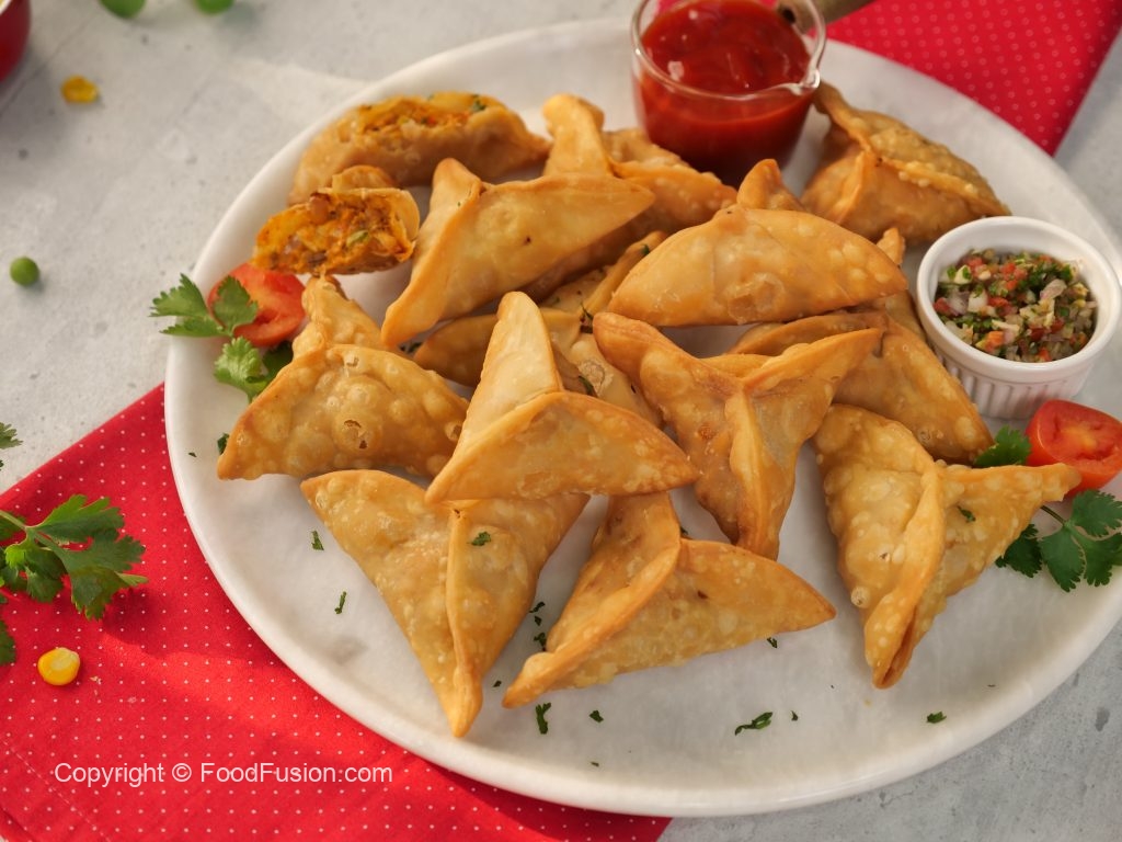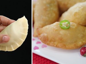 -Add prepared filling,apply water,fold & seal corners to make a samosa (makes 25-30).