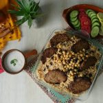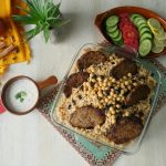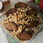 On serving dish,add cooked rice,chickpeas,reserved black raisins,peshawari beef chapli kabab on top and serve!