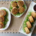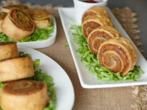 Brush pin wheels slices with oil from both sides and air fry at 180 C for 25 minutes.