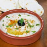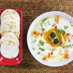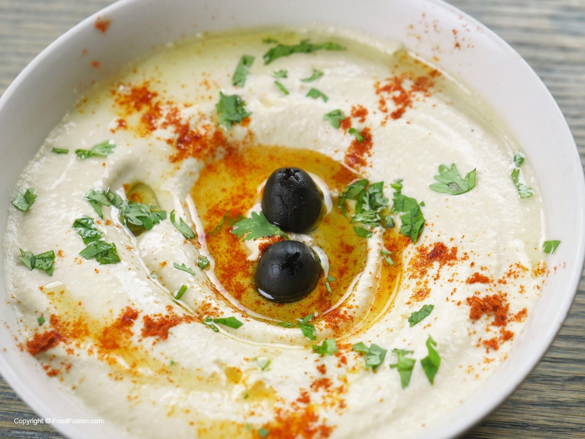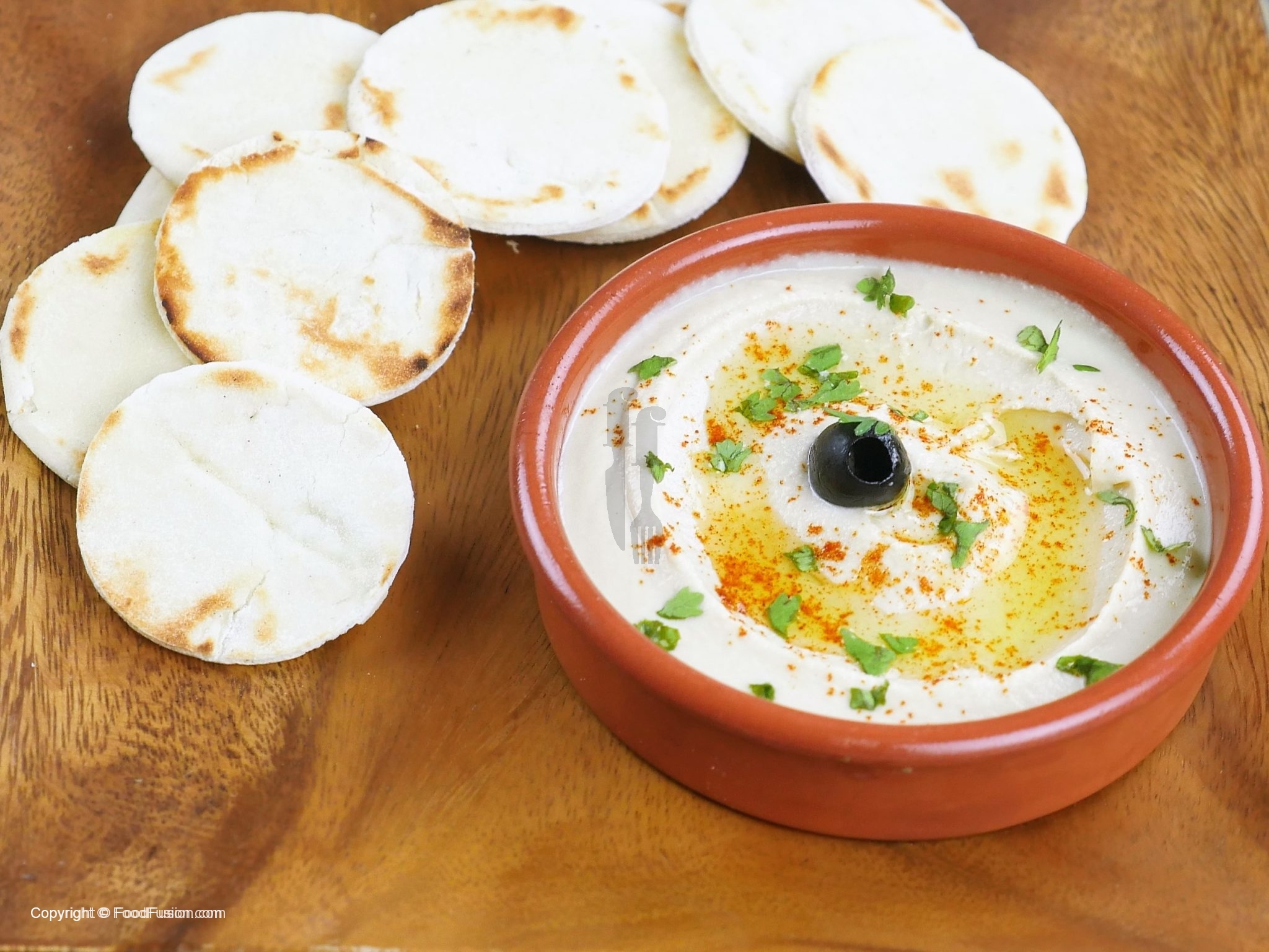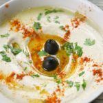 Now dish out hummus, make well with a spoon and drizzle olive oil and paprika. Add 1-2 black or green olive for garnish.