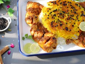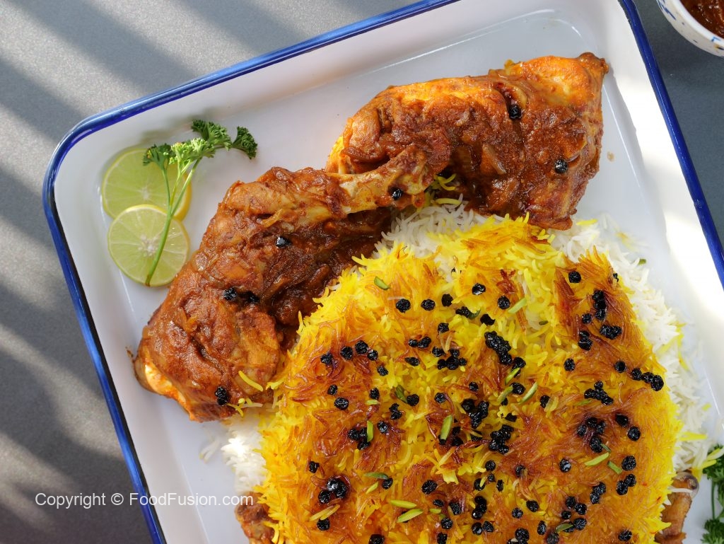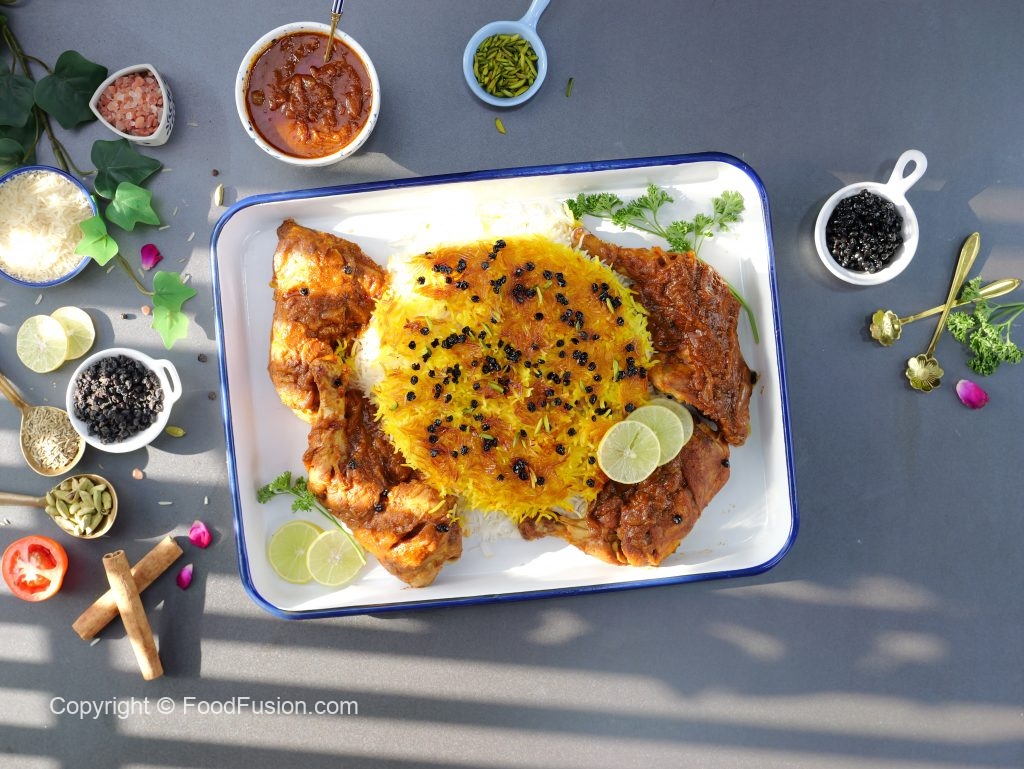 -Flip pot on large tray,placing the crispy part on the top,add chicken pieces with gravy,glazed barberry,pistachios & serve!
