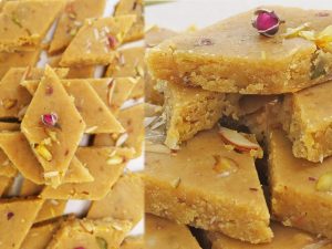 In bowl,add dry milk powder,all-purpose flour,baking powder,cardamom seeds and mix well.