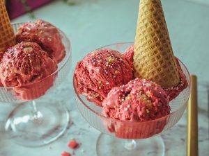Skewer ki madad sa gently swirls bana lein,ice cream ki surface ko butter paper sa cover ker lein aur dhak ker 8 hours ya overnight kliya freeze ker lein (yields: 2.5 litres).