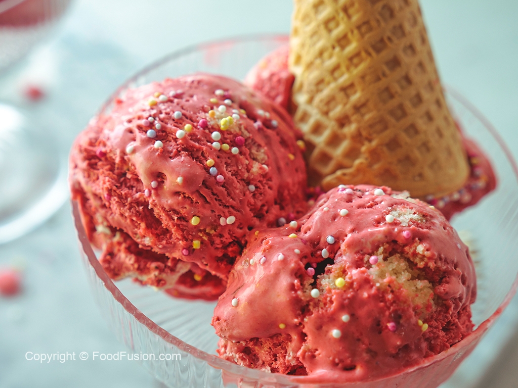 Make swirls gently with the help of skewer,cover the surface of ice cream with butter paper then cover with lid and freeze for 8 hours to overnight (yields: 2.5 litres).