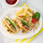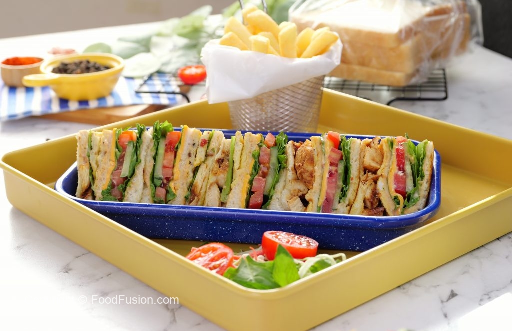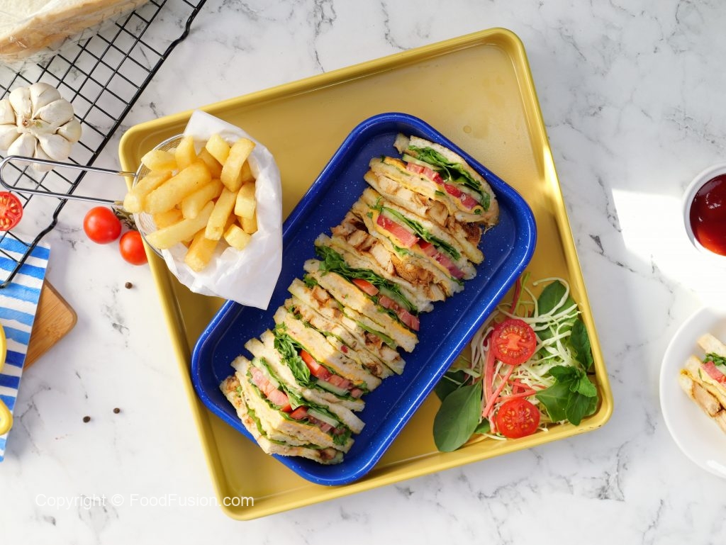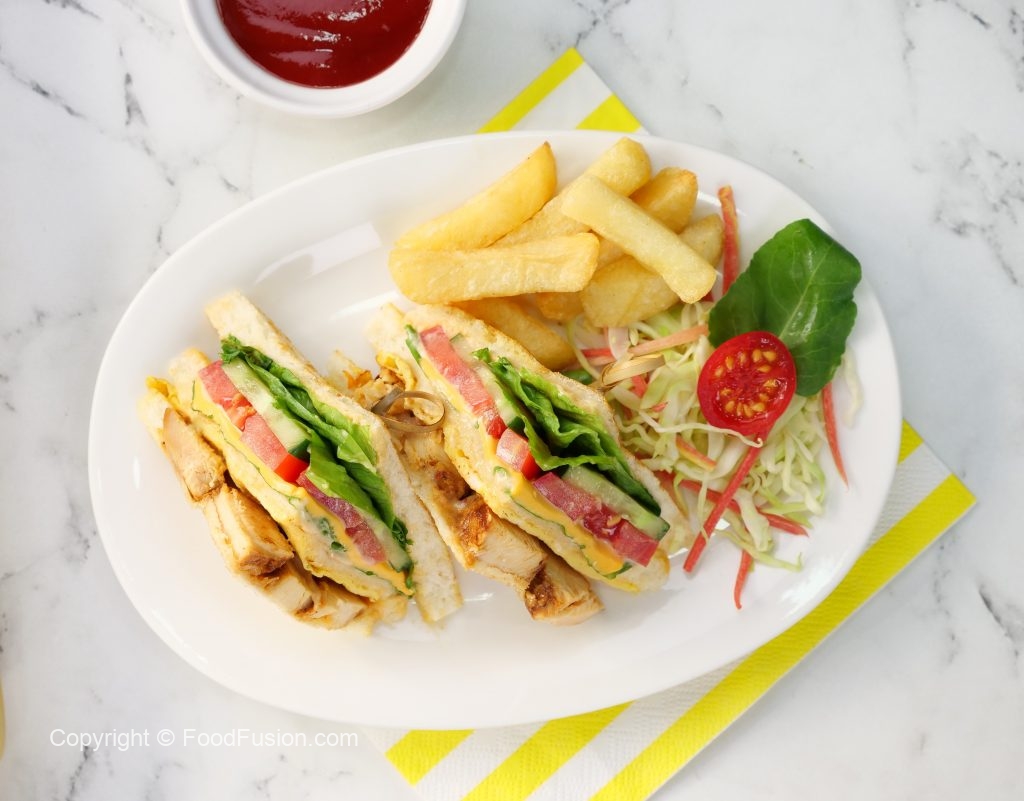 -On one toasted bread slice,add & spread prepared spicy mayo sauce,add prepared grilled chicken slices & prepared egg omelette.