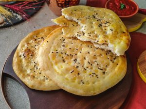 Brush on each naan and sprinkle black & white sesame seeds on top.