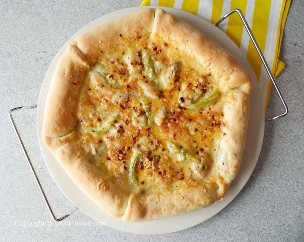 Add mozzarella cheese,cooked chicken,mushrooms,onion,red chili crushed,cheddar cheese,capsicum, mozzarella cheese and sprinkle red chili crushed (makes 2 large pizza).