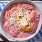 -In a cooking pot, add milk, bring it to boil, add prepared pink tea concentrate, mix well then add pink food color & mix well.