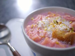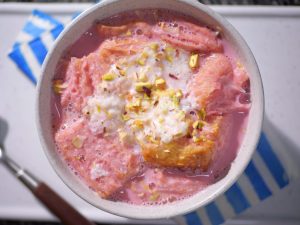 In a traditional serving bowl, add puff biscuits, fresh cream, prepared Kashmiri tea and garnish it with almonds and pistachios.