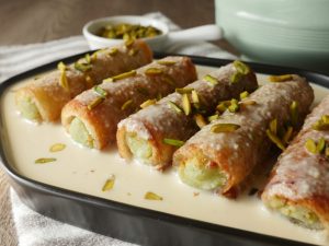 In serving dish,place bread roll ups,pour warm prepared milk.