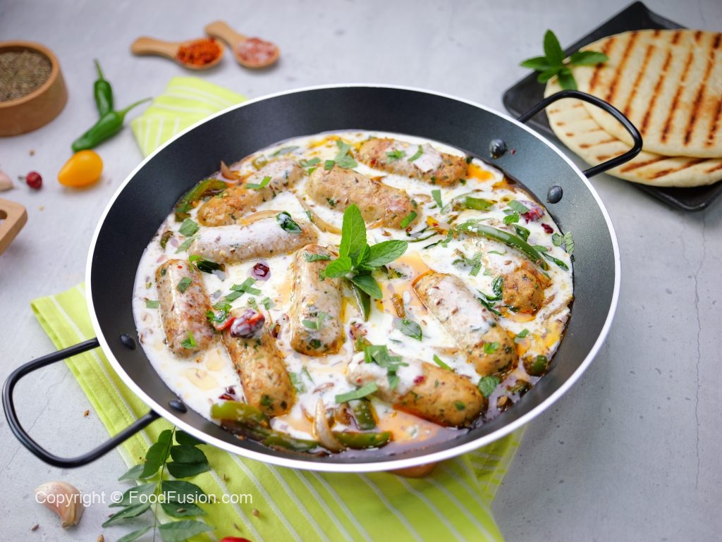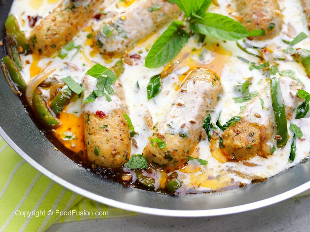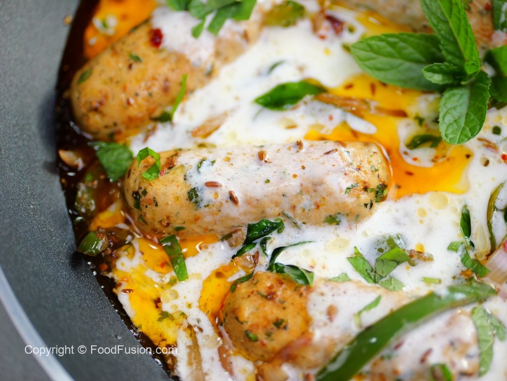 -Grease a plastic sheet with cooking oil,place 50g (2 tbs) of mixture,fold plastic sheet & slide a little to make a cylindrical kabab (makes 16-18).