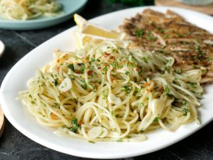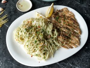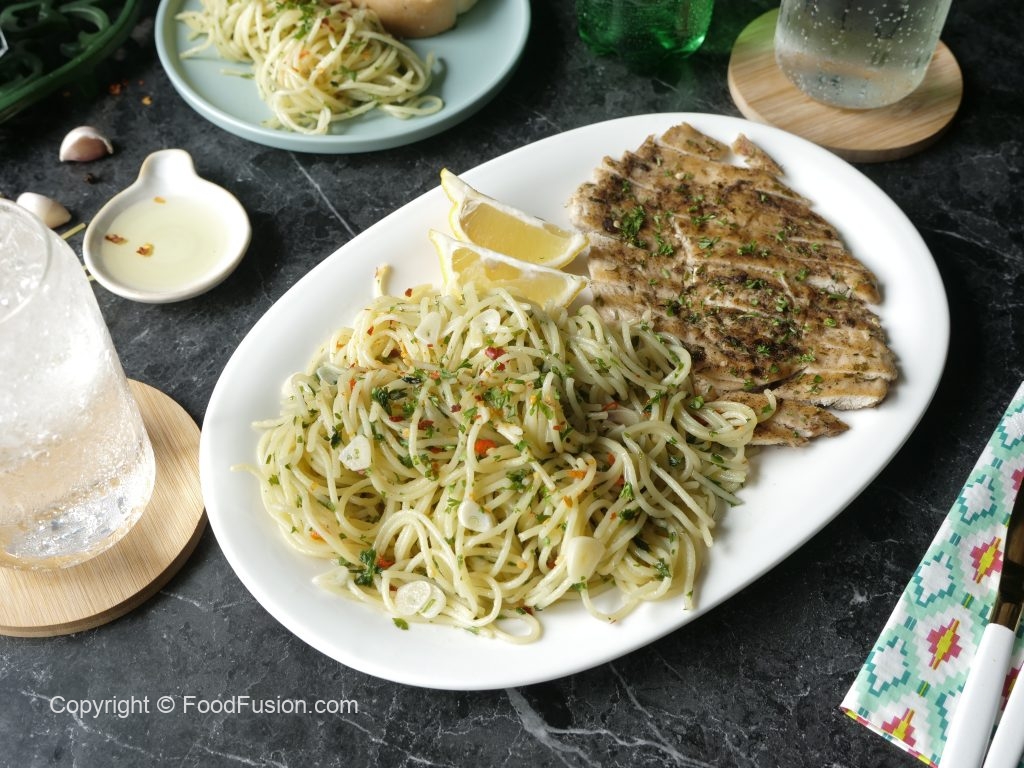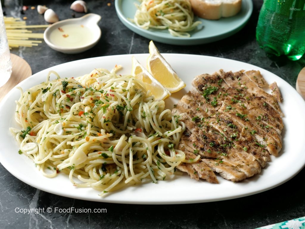 Sprinkle fresh parsley & red chilli crushed & serve spaghetti with grilled chicken & 7up.