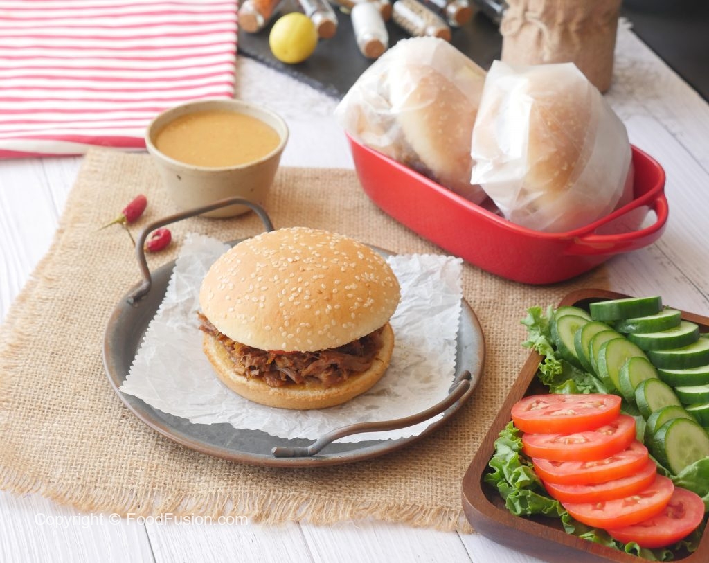 On burger bun,add & spread special mustard sauce,beef mixture,special mustard sauce,tomato and cucumber.