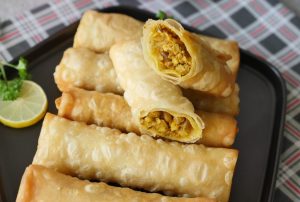 Samosa sheet/manda patti lein aur tayyar filling dal ker tamam sides ko fold ker ka roll ker lein aur maida ka paste laga lein.