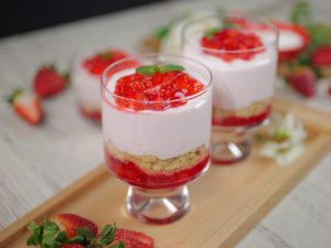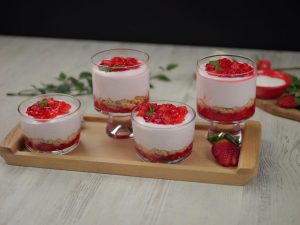 -In a serving glas,add & spread strawberry & jelly mixture,biscuit crumbs,prepared strawberry cream mixture & top with strawberry & jelly mixture.