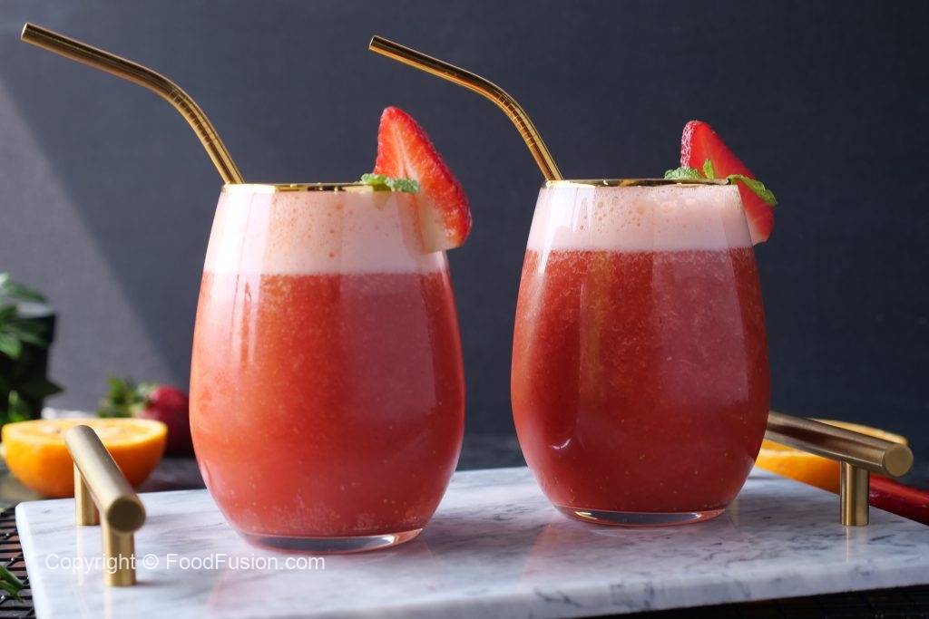Blender jug may fresh strawberries, honey, fresh orange juice, crushed ice daal kara chi tarah blend karlen.