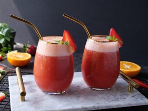 In a blender jug add fresh strawberries, honey, fresh orange juice, crushed ice & blend well.